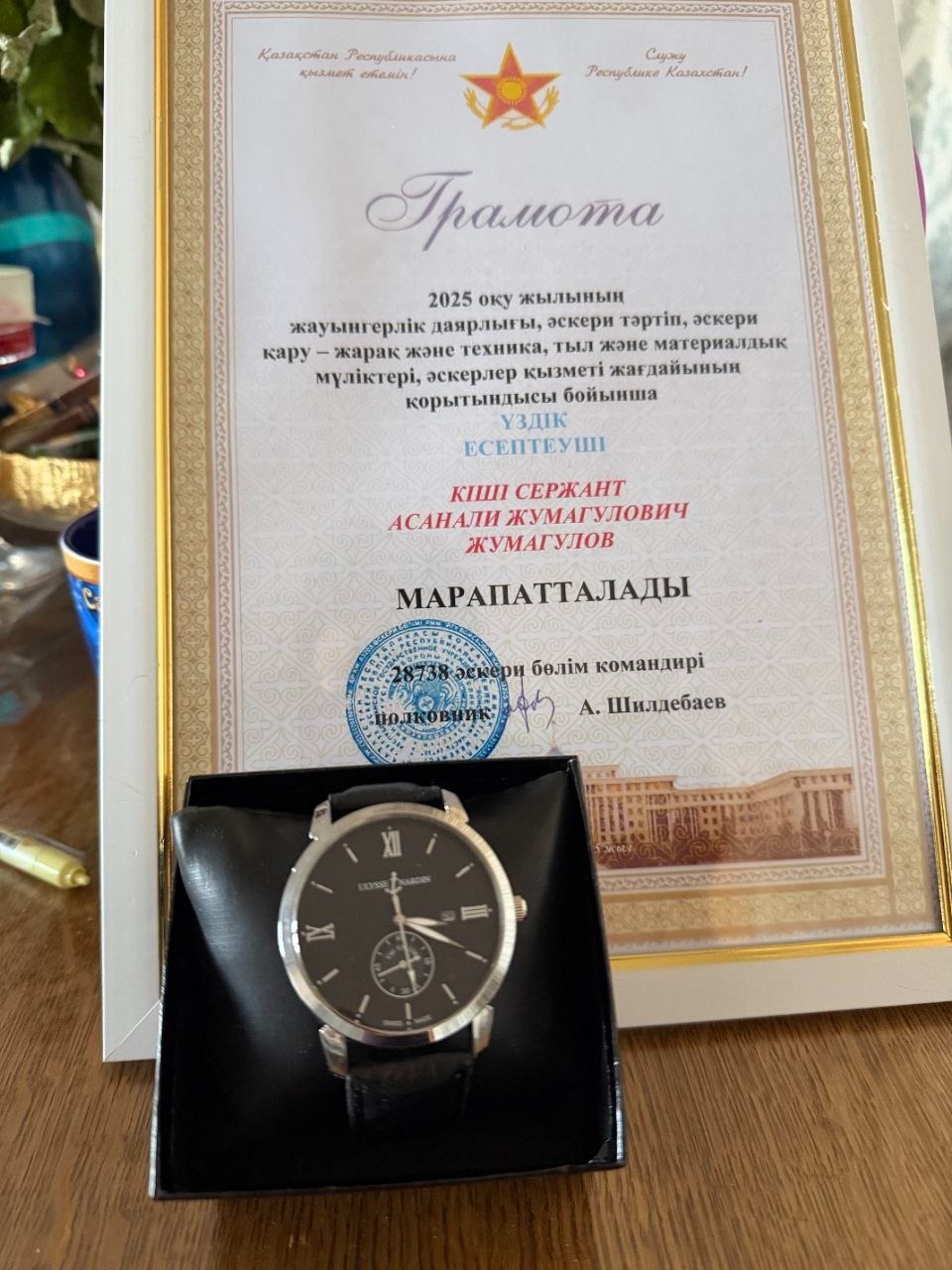 Айта кету керек, кіші сержант Асанәлі Жұмағұлов жауынгерлік дайындықтағы жетістіктері үшін қол сағатпен, ал сарбаздың анасы еліміздің нағыз патриотын тәрбиелегені үшін Қорғаныс Министрінің алғыс хатымен марапатталған болатын.